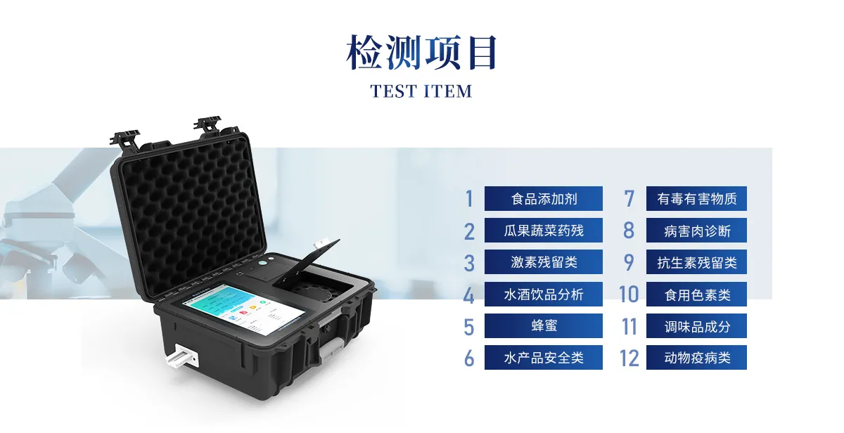 | 食品添加劑:二氧化硫、雙氧水、亞硝酸鹽、硝酸鹽、苯甲酸鈉、山梨酸鉀、糖精鈉、甜蜜素、木耳硫酸鎂等 | 有毒有害物質:甲醛、吊白塊、硼砂、過氧化苯甲酰、溴酸鉀、羅丹明B、三聚氰胺、蘇丹紅、工業堿、尿素、明礬等 | 果蔬:農藥殘留(酶抑制率法) | 病害肉診斷:組胺、揮發性鹽基氮; | 重金屬含量:鉛、鎘、鉻、汞、砷、錫、鎳、鋁等; | 食用油脂: 過氧化值、酸價等 | 瘦肉精激素類(獸藥):鹽酸克倫特羅、沙丁胺醇、萊克多巴胺、己烯雌酚等 | 抗生素殘留類(獸藥):四環素類、硝基呋喃類、磺胺類、β-興奮劑類、沙星類、磺胺類、喹諾酮類,甲砜霉素,氟苯尼考,金剛烷胺、替米考星、慶大霉素、林可霉素、鏈霉素、恩諾沙星、環丙沙星、頭孢啦啶、青霉素、阿莫西林等 | 真菌毒素類:食用油、糧食及飼料中黃曲霉毒素B1、黃曲霉毒素總量,奶中黃曲霉毒素M1、嘔吐毒素、玉米赤霉烯酮、赭曲霉毒素A、T2毒素、伏馬毒素等; | 水酒飲品分析:酒中甲醇、乙醇、乳品及牛奶中蛋白質, | 調味品成分:食醋的總酸、醬油的總酸、芝麻油純度、谷氨酸鈉、醬油氨基酸態氮、食鹽中亞鐵氰化鉀、食鹽中碘等 | 食用色素類:紅色色素(胭脂紅、莧菜紅、赤蘚紅、誘惑紅)、黃色色素(檸檬黃、日落黃)、藍色色素(亮藍)等 | 動物疫病類:禽流感、新城疫、牛羊口蹄疫、牛羊結核病、牛羊包蟲、牛羊布病、小反芻獸、豬藍耳病毒、豬瘟病毒、豬偽狂犬病毒、豬細小、豬圓環、犬細小病毒、犬瘟熱病毒、犬狂犬病毒等; | 蜂蜜成分:果糖和葡萄糖、蔗糖、淀粉酶、酸度等 | 水產品安全類:孔雀石綠、氯霉素、呋喃妥因、呋喃西林、呋喃它酮、呋喃唑酮等 | 蛋類藥物殘留:氯霉素,四環素,磺胺類,喹諾酮類,呋喃西林,呋喃它酮,呋喃妥因,呋喃唑酮,氟苯尼考,阿莫西林、頭孢氨芐、紅霉素、鏈霉素等 |