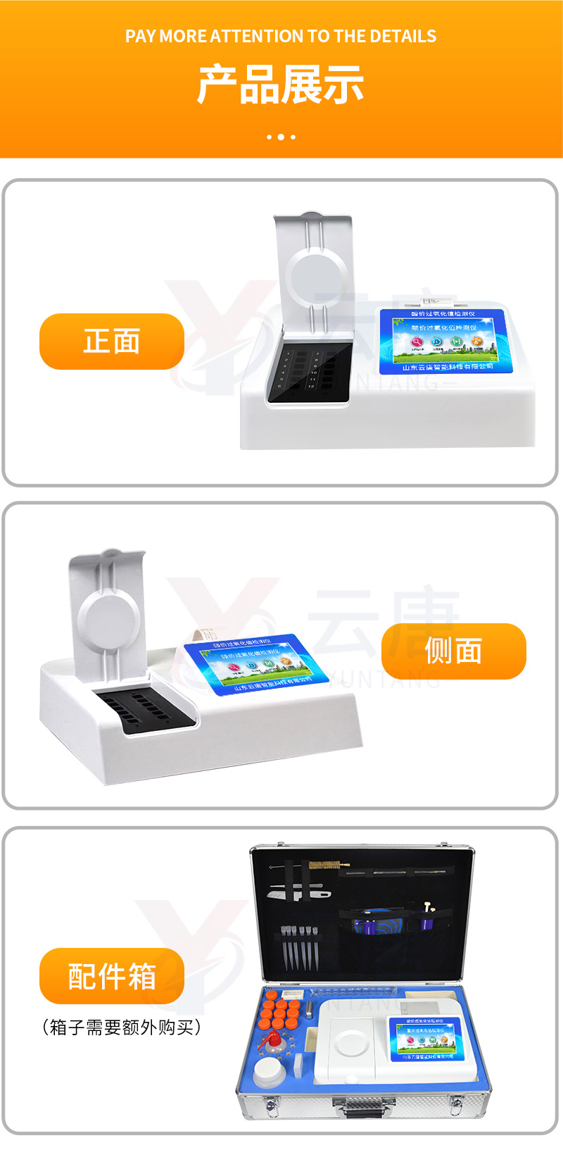 | 儀器采用臺式一體化系統檢測技術,將分光光度模塊、新型農殘檢測模塊、數字化管理模塊、無線通訊模塊高度集成于一體,支持檢測200種食品安全檢測項目,同時預留升級檢測方法。 | 儀器檢測模塊標準化、智能化,可隨意自由組合。檢測箱體內置多個標準檢測單元,檢測模塊可以調整配置。 | 儀器采用全新安卓智能系統,主控芯片采用 ARM Cortex-A7,RK3288/4核處理器,10.1寸高清液晶觸摸豎屏,更加**的UI交互界面,運轉快捷;儀器配備無線通信模塊: 4G(APN)通訊模塊、Wifi模塊,藍牙傳輸,同時具有雙USB接口以及RJ45接口能以多種方式實現數據保存和數據傳輸功能。 | 創新檢測模式: | ★檢測通道:≥12通道;采用精密旋轉比色池設計,使用同芯片同光源校準精度,解決不同光源之間的誤差值。1-12通道間誤差0.1%。(***:**202022821055.2) | ★儀器具有自動識別比色皿檢測功能,即:將樣品比色皿放入儀器后,點擊樣品檢測,儀器自動識別比色皿進行通道檢測。 | 進口高精光源: | 高精度進口四波長冷光源,通道配置 410、520、590、630nm 波長光源,一個光源芯片驅動一個光源,誤差極小,每臺設備單獨**校準光源,**比對,同時參照四種不同波段光源全方位覆蓋市面上99%的農殘食品項目檢測。 | 智能化操作系統: | 便捷操作系統:設備檢測時可在同一檢測界面自動對應相關檢測通道一次性選擇1-12個樣品名稱,無須退出界面,節省操作時間。 | 數據集成系統:設備首頁自動統計檢測數據包含:周檢測數據、月檢測數據,全部檢測總數量,均包含檢測總數,合格數,不合格數,以及相關柱形分析圖,對各項檢測數據清晰掌握,無需電腦查詢,更加快捷直觀。 | 項目預設系統:支持添加單個及多個相同或不相同的任務預設,一鍵快速調取,每一個任務分別可以設置不同的樣品、批次、編號、來源、備注、抽樣信息、檢測信息、受檢信息、復核信息等更多信息。無縫鏈接平臺和APP實時查看下發任務。 | 數據監管系統:同步對接監管平臺,數據可局域網和互聯網數據上傳,檢測結果可選擇直接傳至食品安全監管平臺。集成OSS輸出存儲服務、區分設備定向管理應用,進行區域食品安全監管及大數據分析處理與數據統計,檢測區域食品安全長短期動態,達到食品安全問題預估、預警。 | 自定義打印系統:內置全新打印系統,新創自定義打印方式,可按需靈活設置開啟或關閉:產品合格證(國家農業部標準要求),二維碼,抽樣信息、檢測信息,受檢信息、復核信息、抽樣日期、檢測日期等信息的打印。 | 系統遠程更新功能:可定向分客戶分儀器更新系統,按照不同客戶后期實際需求添加項目,無需機器返廠,即可遠程實時升級全新系統,節省時間成本及避免運輸造成設備損壞。 | 儀器主機采用一體化防水、抗壓、防撞擊、防腐蝕箱體設計,同時配備交直流供電,可連接車載電源,可選配大容量充電鋰電池,滿足現場野外檢測需求。 | 安全證書,放心保障:儀器具有中國計量科學研究院校準證書,權威認證。 |
