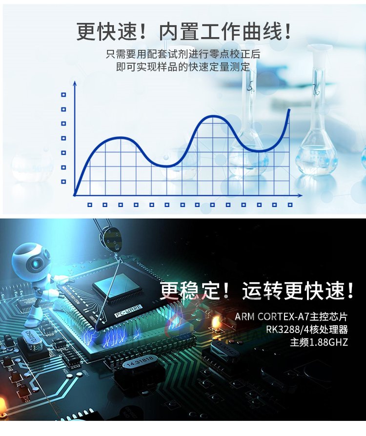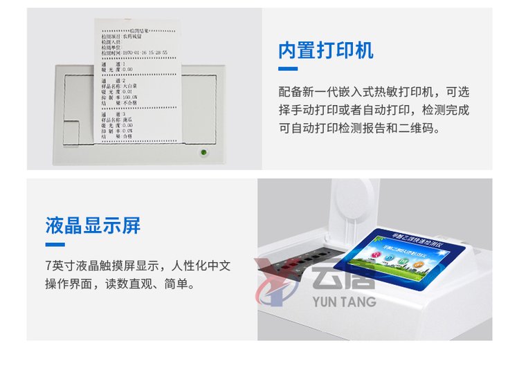 | 儀器采用臺(tái)式一體化系統(tǒng)檢測(cè)技術(shù),將分光光度模塊、新型農(nóng)殘檢測(cè)模塊、數(shù)字化管理模塊、無線通訊模塊高度集成于一體,支持檢測(cè)200種食品安全檢測(cè)項(xiàng)目,同時(shí)預(yù)留升級(jí)檢測(cè)方法。 | 儀器檢測(cè)模塊標(biāo)準(zhǔn)化、智能化,可隨意自由組合。檢測(cè)箱體內(nèi)置多個(gè)標(biāo)準(zhǔn)檢測(cè)單元,檢測(cè)模塊可以調(diào)整配置。 | 儀器采用全新安卓智能系統(tǒng),主控芯片采用 ARM Cortex-A7,RK3288/4核處理器,10.1寸高清液晶觸摸豎屏,更加**的UI交互界面,運(yùn)轉(zhuǎn)快捷;儀器配備無線通信模塊: 4G(APN)通訊模塊、Wifi模塊,藍(lán)牙傳輸,同時(shí)具有雙USB接口以及RJ45接口能以多種方式實(shí)現(xiàn)數(shù)據(jù)保存和數(shù)據(jù)傳輸功能。 | 創(chuàng)新檢測(cè)模式: | ★檢測(cè)通道:≥12通道;采用精密旋轉(zhuǎn)比色池設(shè)計(jì),使用同芯片同光源校準(zhǔn)精度,解決不同光源之間的誤差值。1-12通道間誤差0.1%。(***:**202022821055.2) | ★儀器具有自動(dòng)識(shí)別比色皿檢測(cè)功能,即:將樣品比色皿放入儀器后,點(diǎn)擊樣品檢測(cè),儀器自動(dòng)識(shí)別比色皿進(jìn)行通道檢測(cè)。 | 進(jìn)口高精光源: | 高精度進(jìn)口四波長冷光源,通道配置 410、520、590、630nm 波長光源,一個(gè)光源芯片驅(qū)動(dòng)一個(gè)光源,誤差極小,每臺(tái)設(shè)備單獨(dú)**校準(zhǔn)光源,**比對(duì),同時(shí)參照四種不同波段光源全方位覆蓋市面上99%的農(nóng)殘食品項(xiàng)目檢測(cè)。 | 智能化操作系統(tǒng): | 便捷操作系統(tǒng):設(shè)備檢測(cè)時(shí)可在同一檢測(cè)界面自動(dòng)對(duì)應(yīng)相關(guān)檢測(cè)通道一次性選擇1-12個(gè)樣品名稱,無須退出界面,節(jié)省操作時(shí)間。 | 數(shù)據(jù)集成系統(tǒng):設(shè)備首頁自動(dòng)統(tǒng)計(jì)檢測(cè)數(shù)據(jù)包含:周檢測(cè)數(shù)據(jù)、月檢測(cè)數(shù)據(jù),全部檢測(cè)總數(shù)量,均包含檢測(cè)總數(shù),合格數(shù),不合格數(shù),以及相關(guān)柱形分析圖,對(duì)各項(xiàng)檢測(cè)數(shù)據(jù)清晰掌握,無需電腦查詢,更加快捷直觀。 | 項(xiàng)目預(yù)設(shè)系統(tǒng):支持添加單個(gè)及多個(gè)相同或不相同的任務(wù)預(yù)設(shè),一鍵快速調(diào)取,每一個(gè)任務(wù)分別可以設(shè)置不同的樣品、批次、編號(hào)、來源、備注、抽樣信息、檢測(cè)信息、受檢信息、復(fù)核信息等更多信息。無縫鏈接平臺(tái)和APP實(shí)時(shí)查看下發(fā)任務(wù)。 | 數(shù)據(jù)監(jiān)管系統(tǒng):同步對(duì)接監(jiān)管平臺(tái),數(shù)據(jù)可局域網(wǎng)和互聯(lián)網(wǎng)數(shù)據(jù)上傳,檢測(cè)結(jié)果可選擇直接傳至食品安全監(jiān)管平臺(tái)。集成OSS輸出存儲(chǔ)服務(wù)、區(qū)分設(shè)備定向管理應(yīng)用,進(jìn)行區(qū)域食品安全監(jiān)管及大數(shù)據(jù)分析處理與數(shù)據(jù)統(tǒng)計(jì),檢測(cè)區(qū)域食品安全長短期動(dòng)態(tài),達(dá)到食品安全問題預(yù)估、預(yù)警。 | 自定義打印系統(tǒng):內(nèi)置全新打印系統(tǒng),新創(chuàng)自定義打印方式,可按需靈活設(shè)置開啟或關(guān)閉:產(chǎn)品合格證(國家農(nóng)業(yè)部標(biāo)準(zhǔn)要求),二維碼,抽樣信息、檢測(cè)信息,受檢信息、復(fù)核信息、抽樣日期、檢測(cè)日期等信息的打印。 | 系統(tǒng)遠(yuǎn)程更新功能:可定向分客戶分儀器更新系統(tǒng),按照不同客戶后期實(shí)際需求添加項(xiàng)目,無需機(jī)器返廠,即可遠(yuǎn)程實(shí)時(shí)升級(jí)全新系統(tǒng),節(jié)省時(shí)間成本及避免運(yùn)輸造成設(shè)備損壞。 | 儀器主機(jī)采用一體化防水、抗壓、防撞擊、防腐蝕箱體設(shè)計(jì),同時(shí)配備交直流供電,可連接車載電源,可選配大容量充電鋰電池,滿足現(xiàn)場(chǎng)野外檢測(cè)需求。 | 安全證書,放心保障:儀器具有中國計(jì)量科學(xué)研究院校準(zhǔn)證書,權(quán)威認(rèn)證。 |