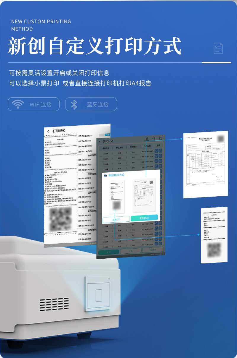 儀器采用手提一體化系統檢測技術,將分光光度模塊、數字化管理模塊、無線通訊模塊高度集成于一體,可支持檢測60種食品安全檢測項目,同時預留升級檢測方法。儀器檢測模塊標準化、智能化,檢測項目可隨意自由組合。檢測箱體內置多個標準檢測單元,檢測模塊可以調整配置。顯示屏幕:儀器采用10.1英寸豎向液晶觸摸屏顯,搭配運行安卓智能操作系統,主控芯片采用ARM Cortex-A7,RK3288/4核處理器,主頻1.88Ghz,操作方便,性能更強。檢測通道:≥12通道;采用精密旋轉比色池設計,使用同芯片同光源校準精度,解決不同光源之間的誤差值,更加準確**。(1-12通道間誤差0.1%,***:**202022821055.2)儀器光源:高精度進口四波長冷光源,每個通道均配置 410、520、590、630nm 波長光源,標配**的光路切換裝置,專利光路切換功能可實現64波長,并且所有檢測項目可實現所有通道同時檢測。設備可一鍵校準,自動保存校準數據,自動對比校驗,得到精準光源,采用Android SP存儲數據,光源數據永不丟失,方便每一次使用。通訊接口:配備無線通信模塊、4G(APN)通訊模塊、藍牙傳輸,同時具有雙USB接口以及RJ45網線接口,可以多方式實現數據保存及數據傳輸。存儲方式:支持U盤存儲,標準USB接口,免驅動安裝。檢測結果存儲容量20萬條以上,可生成Excel表格進行拷貝,并具有登錄保護功能。智能化操作系統:1、操作系統:儀器可在同一檢測界面自動對應相關檢測通道,一次性選擇1-12個樣品名稱,無需退出界面,節省操作時間。并可以對每個通道屬性和樣品信息單獨進行編輯,例如送檢單位、人員,檢測人員等,打印時勾選打印顯示。2、數據集成系統:設備首頁自動匯總分析檢測數據,包含:周檢測數據、月檢測數據,全部檢測總數量,均包含檢測總數,合格數,不合格數,以及相關柱形分析圖,各項檢測數據一目了然,無需電腦查詢,更加快捷直觀。3、數據庫系統:十幾項數據庫分類管理儀器:包含項目類型、項目數據、檢測數據、歷史記錄、國標信息、曲線信息、采樣信息、檢測信息、受檢信息、復核信息、圖表信息、光源校準信息、打印樣式信息、樣品庫信息等等,數據庫之間互相協調聯動保證數據的真實完整性。同時產品數據庫以及歷史檢測記錄支持一鍵檢索功能。4、限量規判系統:具有限量查詢、添加物質合規判定系統。檢測出結果后,系統自動調用系統數據庫中相關國標進行比對判定,客觀顯示判定結果是否合格。5、項目預設系統:儀器具有任務預設模塊,一鍵提前預設,給出方便快捷的新檢測方案,每一個任務分別可以設置不同的樣品、批次、編號、來源、備注、抽樣信息、檢測信息、受檢信息、復核信息等更多信息。樣品送檢時一鍵調取保存信息,并可多次調取,大大提高檢測效率。6、數據監管系統:同步對接監管平臺,數據可局域網和互聯網數據上傳,檢測結果可選擇直接傳至食品安全監管平臺。進行區域食品安全監管及大數據分析處理與數據統計,檢測區域食品安全長短期動態,達到食品安全問題預估、預警。7.1、全新打印系統:內置全新打印機,新創自定義打印方式,可按需靈活勾選控制:二維碼,抽樣信息、檢測信息,受檢信息、復核信息、抽樣日期、檢測日期等信息的打印。7.2、A4紙版本報告打印功能(可選配):設備擁有兩種結果展示方式,可以自動生成A4打印模板和小票打印模板兩種樣式,可通過WiFi及網線等方式鏈接外置打印機可進行打印。供電模式:儀器交直流兩用,直流12V供電,可連接車載電源,可配6ah大容量充電鋰電池,電量可實時顯示,方便戶外流動測試。儀器具備遠程升級功能,可定向分客戶分儀器更新,開機后自動更新,并可持續性免費更新系統版本,無需像傳統產品返廠更新,節省時間及人力成本并避免了物流運輸返廠升級導致設備損壞的潛在風險。