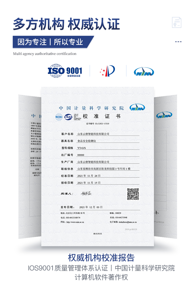 儀器采用手提式一體化系統檢測技術,將分光光度模塊、新型農殘檢測模塊、數字化管理模塊、無線通訊模塊高度集成于一體,支持檢測200種食品安全檢測項目,同時預留升級檢測方法。儀器檢測模塊標準化、智能化,檢測項目可隨意自由組合。檢測箱體內置多個標準檢測單元,檢測模塊可以調整配置。顯示屏幕:儀器采用10.1英寸豎向液晶觸摸屏顯,搭配運行安卓智能操作系統,主控芯片采用ARM Cortex-A7,RK3288/4核處理器,主頻1.88Ghz,操作方便,性能更強。檢測通道:≥12通道;采用精密旋轉比色池設計,使用同芯片同光源校準精度,解決不同光源之間的誤差值,更加準確**。(1-12通道間誤差0.1%,***:**202022821055.2)儀器光源:高精度進口四波長冷光源,每個通道均配置 410、520、590、630nm 波長光源,標配**的光路切換裝置,專利光路切換功能可實現64波長,并且所有檢測項目可實現所有通道同時檢測。設備可一鍵校準,自動保存校準數據,自動對比校驗,得到精準光源,采用Android SP存儲數據,光源數據永不丟失,方便每一次使用。通訊接口:配備無線通信模塊、4G(APN)通訊模塊、藍牙傳輸,同時具有雙USB接口以及RJ45網線接口,可以多方式實現數據保存及數據傳輸存儲方式:支持U盤存儲,標準USB接口,免驅動安裝。檢測結果存儲容量20萬條以上,可生成Excel表格進行拷貝,并具有登錄保護功能。智能化操作系統:1)操作系統:儀器可在同一檢測界面自動對應相關檢測通道,一次性選擇1-12個樣品名稱,無需退出界面,節省操作時間。并可以對每個通道屬性和樣品信息單獨進行編輯,例如送檢單位、人員,檢測人員等,打印時勾選打印顯示。2)數據集成系統:設備首頁自動匯總分析檢測數據,包含:周檢測數據、月檢測數據,全部檢測總數量,均包含檢測總數,合格數,不合格數,以及相關柱形分析圖,各項檢測數據一目了然,無需電腦查詢,更加快捷直觀。3)數據庫系統:十幾項數據庫分類管理儀器:包含項目類型、項目數據、檢測數據、歷史記錄、國標信息、曲線信息、采樣信息、檢測信息、受檢信息、復核信息、圖表信息、光源校準信息、打印樣式信息、樣品庫信息等等,數據庫之間互相協調聯動保證數據的真實完整性。同時產品數據庫以及歷史檢測記錄支持一鍵檢索功能。4)限量規判系統:具有限量查詢、添加物質合規判定系統。檢測出結果后,系統自動調用系統數據庫中相關國標進行比對判定,客觀顯示判定結果是否合格。5)項目預設系統:儀器具有任務預設模塊,一鍵提前預設,給出方便快捷的新檢測方案,每一個任務分別可以設置不同的樣品、批次、編號、來源、備注、抽樣信息、檢測信息、受檢信息、復核信息等更多信息。樣品送檢時一鍵調取保存信息,并可多次調取,大大提高檢測效率。6)數據監管系統:同步對接監管平臺,數據可局域網和互聯網數據上傳,檢測結果可選擇直接傳至食品安全監管平臺。進行區域食品安全監管及大數據分析處理與數據統計,檢測區域食品安全長短期動態,達到食品安全問題預估、預警。7)打印系統:內置全新打印機,新創自定義打印方式,可按需靈活勾選控制:產品合格證(國家農業部標準要求),二維碼,抽樣信息、檢測信息,受檢信息、復核信息、抽樣日期、檢測日期等信息的打印。供電模式:儀器交直流兩用,直流12V供電,可連接車載電源,可配6ah大容量充電鋰電池,電量可實時顯示,方便戶外流動測試。膠體金檢測模塊:采用雙通道CMOS成像處理技術及膠體金免疫層析技術,可同時讀取雙膠體金卡數據,自動采集、處理分析,將檢測結果顯示,并可根據參考限值自動判斷檢測結果,可檢測常見的獸藥殘留、生物毒素、抗生素、違禁添加物等。1)探測技術:CMOS成像探測;2)檢測通道:1個通道;3)檢測方式:消線法和比色法;4)顯示模式:陰性或陽性;5)曲線形式:軌道式掃描方式,顯示金標卡圖像,實時生成、識別CT曲線圖,無需手動調整,完成檢測后自動退出檢測卡。兼容市場上其他金標卡,使用耗材不受限制。儀器加入遠程升級功能,可定向分客戶分儀器更新,開機后自動更新,客戶無需任何操作,即可升級全新項目。做到了無需退換機器即可實現實時遠程升級檢測儀器。