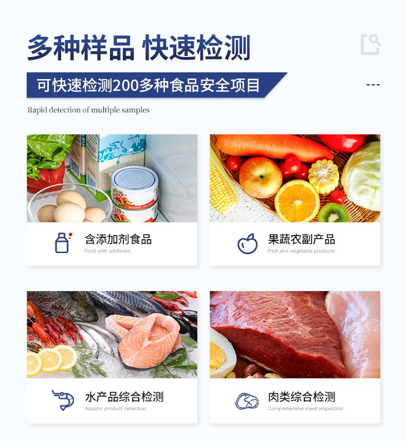 可快速檢測病害肉、組胺、揮發性鹽基氮,儀器預留其他項目檢測程序和端口,根據日后需求可方便的自主增加檢測項目。