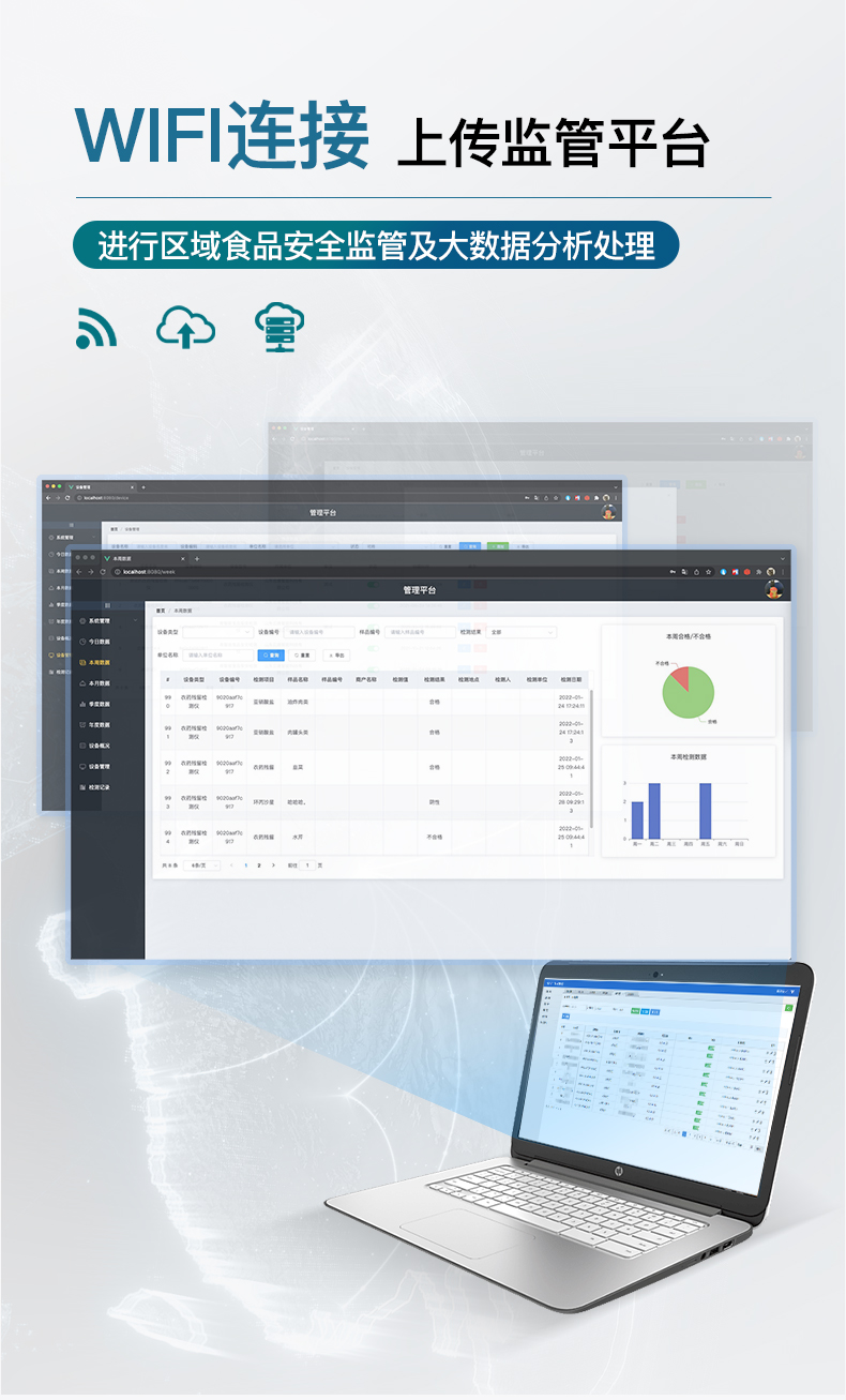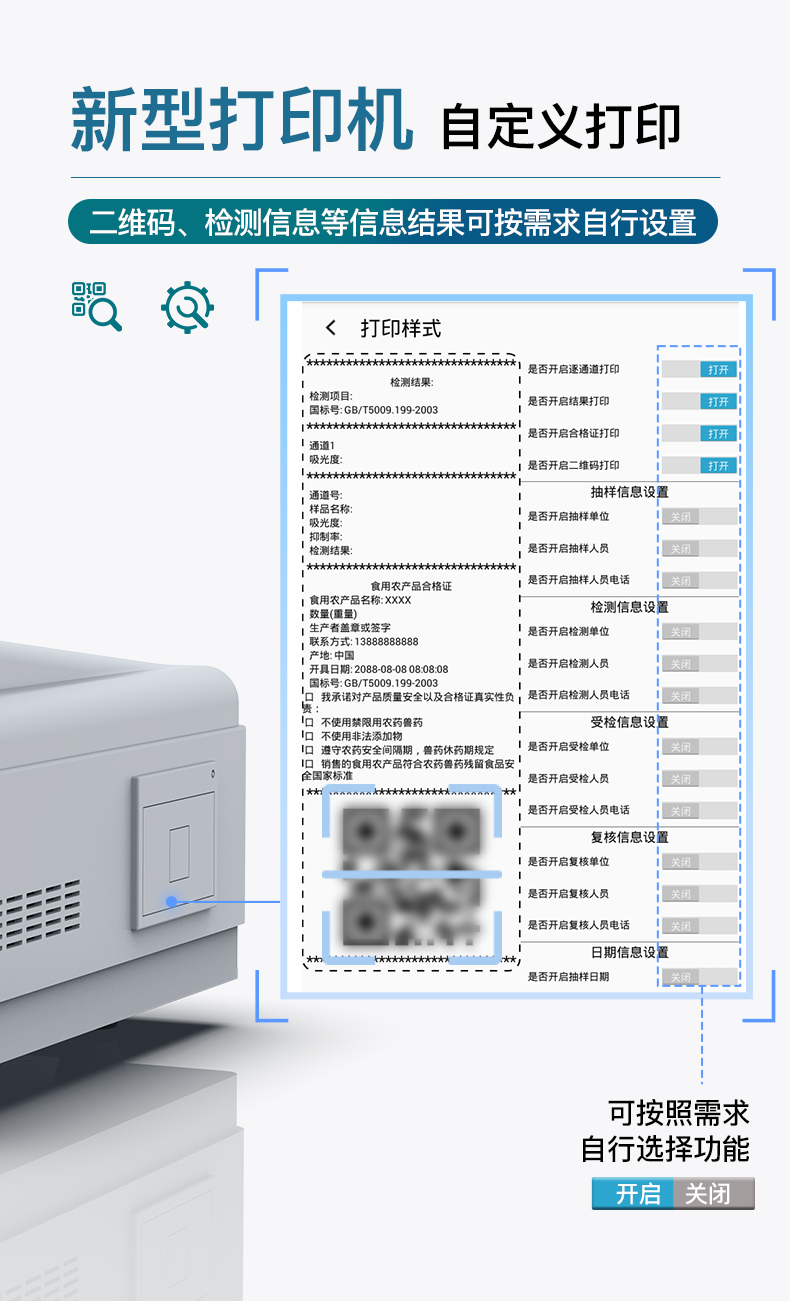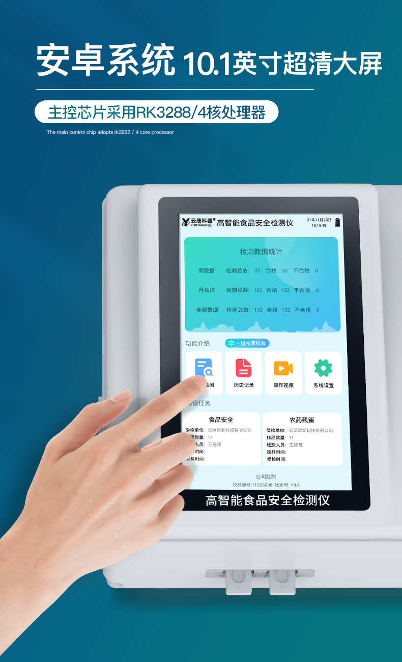 | 1、儀器采用臺式一體化系統檢測技術,將分光光度模塊、膠體金檢測模塊、新型農殘檢測模塊、數字化管理模塊、無線通訊模塊高度集成于一體,支持檢測200種食品安全檢測項目,同時預留升級檢測方法。 | 2、儀器檢測模塊標準化、智能化,檢測項目可隨意自由組合。檢測箱體內置多個標準檢測單元,檢測模塊可以調整配置。 | 3、顯示屏幕:儀器采用10.1英寸豎向液晶觸摸屏顯,搭配運行安卓智能操作系統,主控芯片采用ARM Cortex-A7,RK3288/4核處理器,主頻1.88Ghz,操作方便,性能更強。 | 4、檢測通道:≥12通道;采用精密旋轉比色池設計,使用同芯片同光源校準精度,解決不同光源之間的誤差值,更加準確**。(1-12通道間誤差0.1%,***:**202022821055.2) | 5、儀器光源:高精度進口四波長冷光源,每個通道均配置 410、520、590、630nm 波長光源,標配**的光路切換裝置,專利光路切換功能可實現64波長,并且所有檢測項目可實現所有通道同時檢測。 | 6、設備可一鍵校準,自動保存校準數據,自動對比校驗,得到精準光源,采用Android SP存儲數據,光源數據永不丟失,方便每一次使用。 | 7、通訊接口:配備無線通信模塊、4G(APN)通訊模塊、藍牙傳輸,同時具有雙USB接口以及RJ45網線接口,可以多方式實現數據保存及數據傳輸。 | 8、存儲方式:支持U盤存儲,標準USB接口,免驅動安裝。檢測結果存儲容量20萬條以上,可生成Excel表格進行拷貝,并具有登錄保護功能。 | 9、智能化操作系統: | 9.1、操作系統:儀器可在同一檢測界面自動對應相關檢測通道,一次性選擇1-12個樣品名稱,無需退出界面,節省操作時間。并可以對每個通道屬性和樣品信息單獨進行編輯,例如送檢單位、人員,檢測人員等,打印時勾選打印顯示。 | 9.2、數據集成系統:設備首頁自動匯總分析檢測數據,包含:周檢測數據、月檢測數據,全部檢測總數量,均包含檢測總數,合格數,不合格數,以及相關柱形分析圖,各項檢測數據一目了然,無需電腦查詢,更加快捷直觀。 | 9.3、數據庫系統:十幾項數據庫分類管理儀器:包含項目類型、項目數據、檢測數據、歷史記錄、國標信息、曲線信息、采樣信息、檢測信息、受檢信息、復核信息、圖表信息、光源校準信息、打印樣式信息、樣品庫信息等等,數據庫之間互相協調聯動保證數據的真實完整性。同時產品數據庫以及歷史檢測記錄支持一鍵檢索功能。 | 9.4、限量規判系統:具有限量查詢、添加物質合規判定系統。檢測出結果后,系統自動調用系統數據庫中相關國標進行比對判定,客觀顯示判定結果是否合格。 | 9.5、項目預設系統:儀器具有任務預設模塊,一鍵提前預設,給出方便快捷的新檢測方案,每一個任務分別可以設置不同的樣品、批次、編號、來源、備注、抽樣信息、檢測信息、受檢信息、復核信息等更多信息。樣品送檢時一鍵調取保存信息,并可多次調取,大大提高檢測效率。 | 9.6、數據監管系統:同步對接監管平臺,數據可局域網和互聯網數據上傳,檢測結果可選擇直接傳至食品安全監管平臺。進行區域食品安全監管及大數據分析處理與數據統計,檢測區域食品安全長短期動態,達到食品安全問題預估、預警。 | 9.7.1、全新打印系統:內置全新打印機,新創自定義打印方式,可按需靈活勾選控制:產品合格證(國家農業部標準要求),二維碼,抽樣信息、檢測信息,受檢信息、復核信息、抽樣日期、檢測日期等信息的打印。 | 9.7.2、A4紙版本報告打印功能(選配):設備擁有兩種結果展示方式,可以自動生成A4打印模板和小票打印模板兩種樣式,可通過WiFi及網線等方式鏈接外置打印機可進行打印。 | 10、供電模式:儀器交直流兩用,直流12V供電,可連接車載電源,可配6ah大容量充電鋰電池,電量可實時顯示,方便戶外流動測試。 | 11、膠體金檢測模塊:采用單通道CMOS成像處理技術及膠體金免疫層析技術,可讀取膠體金卡數據,自動采集、處理分析,將檢測結果顯示,并可根據參考限值自動判斷檢測結果,可檢測常見的獸藥殘留、生物毒素、抗生素、違禁添加物等。 | 11.1、探測技術:CMOS成像探測; | 11.2、檢測通道:1個通道; | 11.3、檢測方式:消線法和比色法; | 11.4、顯示模式:陰性或陽性; | 11.5、曲線形式:直插式掃描方式,顯示金標卡圖像,實時生成、識別CT曲線圖,無需手動調整,完成檢測后自動退出檢測卡。兼容市場上其他金標卡,使用耗材不受限制。 | 12、儀器具備遠程升級功能,可定向分客戶分儀器更新,開機后自動更新,并可持續性免費更新系統版本,無需像傳統產品返廠更新,節省時間及人力成本并避免了物流運輸返廠升級導致設備損壞的潛在風險。 |