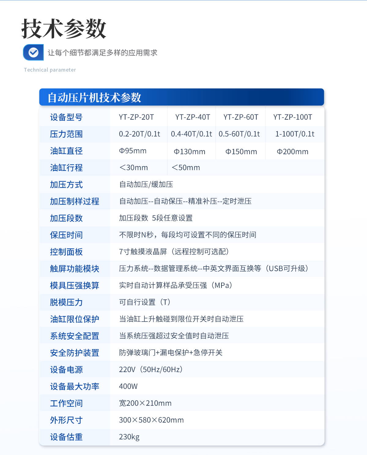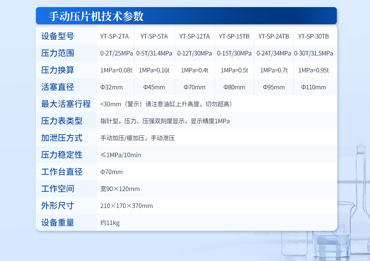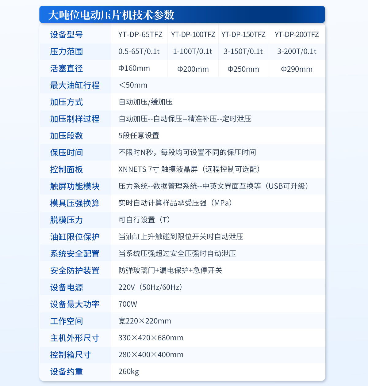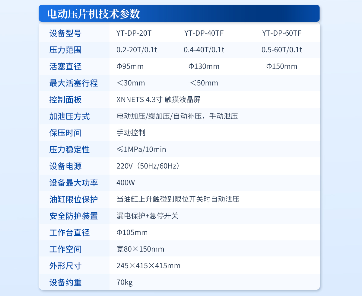 產品概述:該機的優勢是壓力大、空間大,可操作性強,采用分體式結構,7寸觸摸液晶屏,自動化程序波段控制,操作界面可中英文互換,主要用于大規格模具在大壓力下的樣品制備;全系標配防彈玻璃防護罩,操作生產安全又放心。技術參數:設備型號:YT-DP-65TFZ壓力范圍:0.5-65T/0.1t油缸直徑:Φ160mm油缸行程:<50mm加壓方式:自2026-04-14