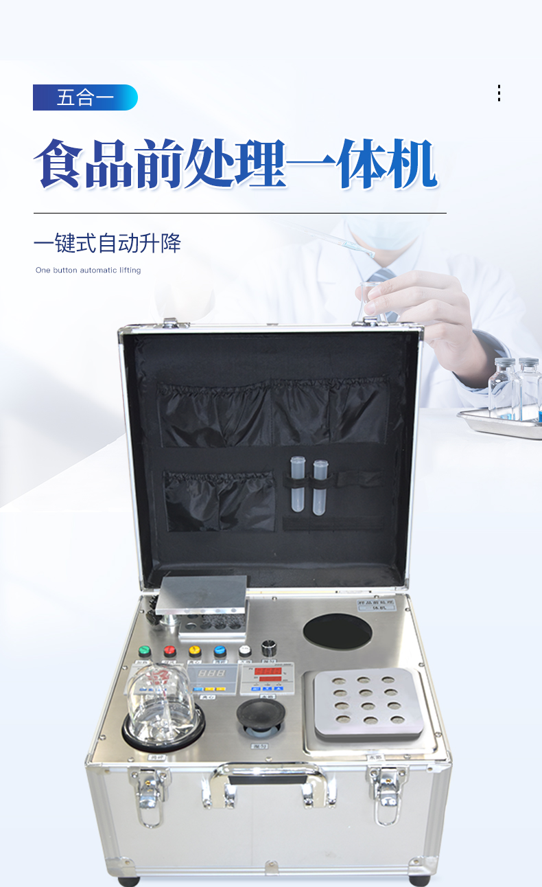 本公司應國內用戶的實際需求,自行研制開發的新型儀器——YT-HQC05型樣品前處理一體機。樣品前處理一體機將樣本前處理過程中樣品濃縮、離心分層、均質、振蕩混勻、水浴等步驟所需設備進行集成,僅需一臺設備即可完成所有樣本前處理過程,并且方便攜帶,不僅適用于現場檢測使用,還可用于色譜、質譜等分析樣品的純化和制備。