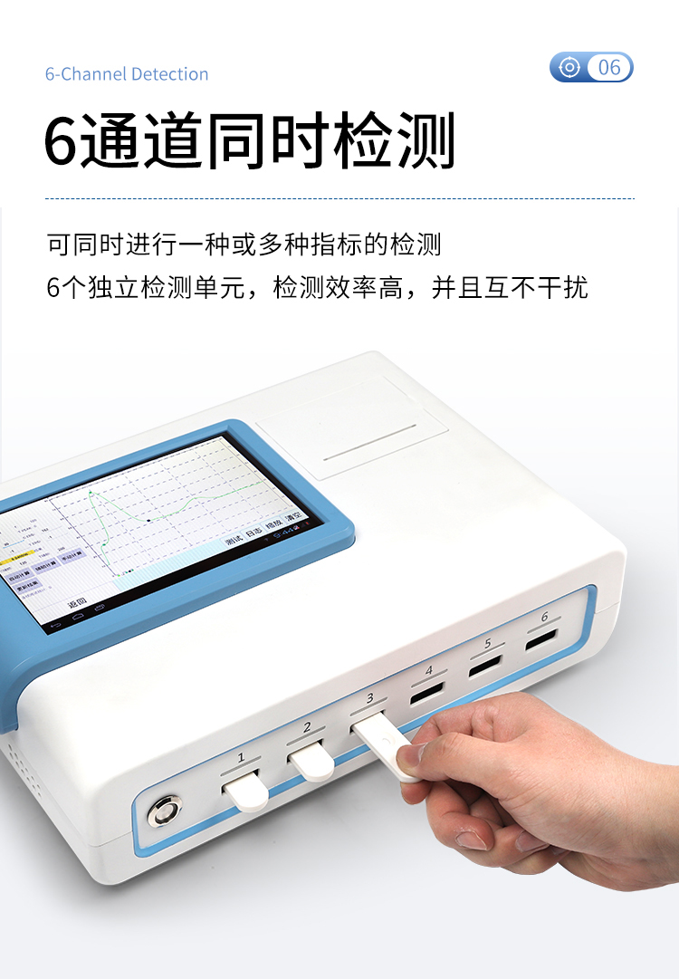 一體化設計,集成孵育和檢測功能同時進行,孵育完成直接檢測;全中文 7英寸高清液晶顯示,觸摸屏操作;Android 系統,支持在線升級,可WIFI聯網;檢測原理:熒光定量免疫層析法;6通道設計,可同時進行一種或多種指標的檢測,6個獨立檢測單元,檢測效率高,并且互不干擾;具有二維碼自動識別系統,可直接識別檢測項目、檢測流程等信息;儀器自帶熱敏打印機,檢測結果可實時打印;具有檢測數據存儲(存儲數量不少于 10000 條)、查詢、批量數據處理和打印功能;儀器≥2 個USB 接口,可拷貝結果及原始數據,具有 wifi 接入模塊,可通過無線連接網 絡實現數據上傳;分鐘內達到工作狀態(37℃),封閉系統,不受外界環境(光、熱)干擾,工作環境溫度:0-30℃;相對極差≤10%;重復性 CV≤1%;批間變異≤3%;尺寸310x210x93mm