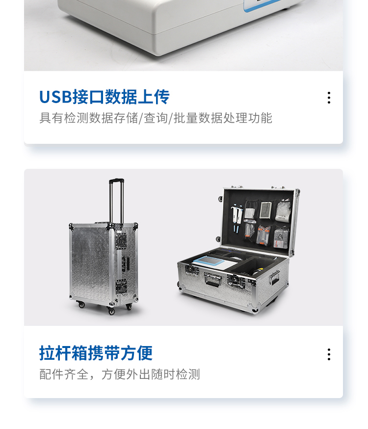 一體化設計,集成孵育和檢測功能同時進行,孵育完成直接檢測;全中文 7英寸高清液晶顯示,觸摸屏操作;Android 系統,支持在線升級,可WIFI聯網;檢測原理:熒光定量免疫層析法;6通道設計,可同時進行一種或多種指標的檢測,6個獨立檢測單元,檢測效率高,并且互不干擾;具有二維碼自動識別系統,可直接識別檢測項目、檢測流程等信息;儀器自帶熱敏打印機,檢測結果可實時打印;具有檢測數據存儲(存儲數量不少于 10000 條)、查詢、批量數據處理和打印功能;儀器≥2 個USB 接口,可拷貝結果及原始數據,具有 wifi 接入模塊,可通過無線連接網 絡實現數據上傳;分鐘內達到工作狀態(37℃),封閉系統,不受外界環境(光、熱)干擾,工作環境溫度:0-30℃;相對極差≤10%;重復性 CV≤1%;批間變異≤3%;尺寸310x210x93mm